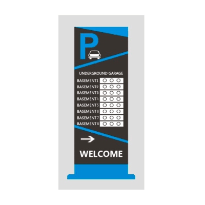 Экран навигации | Отображает приветственные сообщения и информацию об оставшемся месте на этаже всей парковки | Пиксельный состав модуля: 1R1G Двухцветный | Количество модулей: 8 | Интерфейс: Ethernet 1×RJ45 10M/100Mbps / 1×RS485 / 1×RS232 | Расстояние связи: 1200м (последоват. порт) / 120м (сетевой кабель) | Цвет: Черный/Синий | Питание: АC 110-220V | Размер: 150×700×3000мм / 320×160мм (модуль)